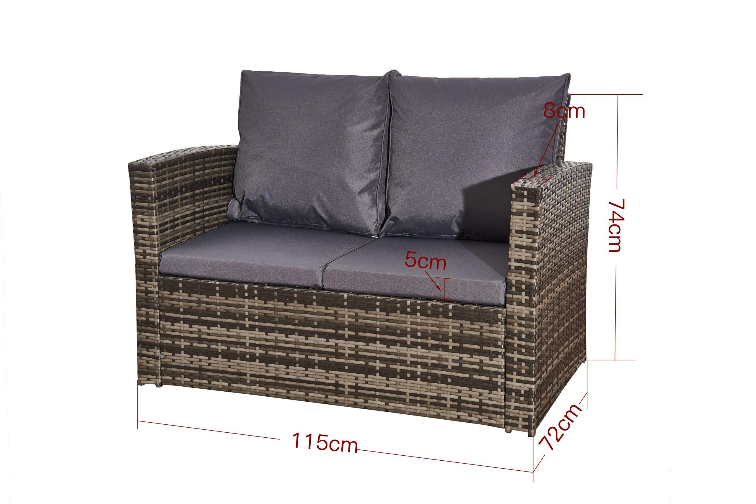 Crafted with intricately woven wicker in a sophisticated Mix Grey colour, this set adds a touch of elegance to any environment. The Dark Grey cushions, made from 160g waterproof polyester with 5cm seat cushioning (PP cotton), offer both comfort and durability, ensuring your relaxation experience is top-notch.